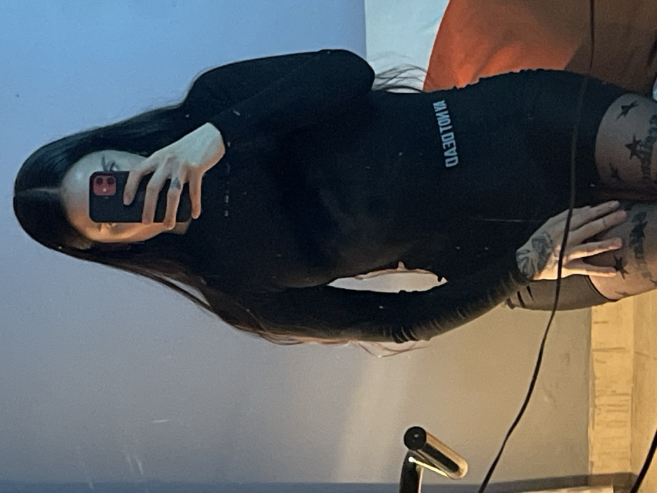 A woman with long, dark hair takes a selfie in a mirror. She wears a long-sleeved, black, tight-fitting dress with the text "DEAD NOT YA" in reverse lettering. She holds a phone in her left hand. Her right hand rests on her left wrist. Tattoos are visible on her hands. She also wears star patterned pantyhose. A microphone is near the bottom of the frame. A mirror and an orange bedspread appear behind her.