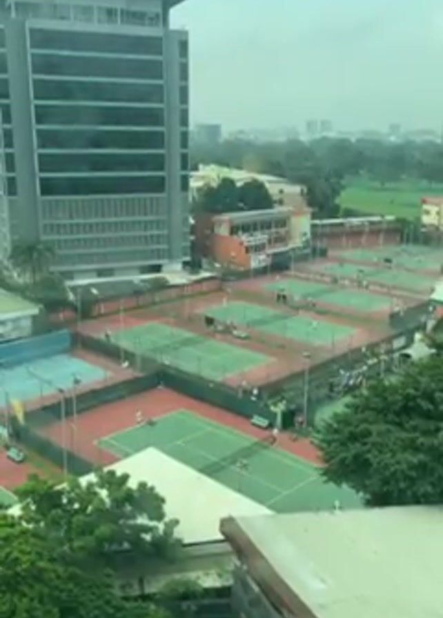 From an elevated vantage point behind a window, the video shows multiple red and green tennis courts, each appearing to be in use. People are visible on the courts, moving and presumably playing tennis. A tall, modern building with multiple floors stands adjacent to the tennis courts. Beyond the courts and buildings, a cityscape stretches into the distance, obscured by an overcast sky. The foreground includes parts of nearby rooftops and green foliage, framing the tennis court area.
