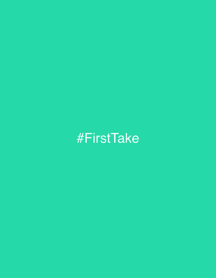 A solid, vibrant turquoise background fills the frame. In the center, the hashtag "#FirstTake" is displayed in white, sans-serif font. The text is clear and easily readable, positioned centrally to draw the viewer's eye. The overall composition is simple, emphasizing the hashtag against the bright, monochrome backdrop.