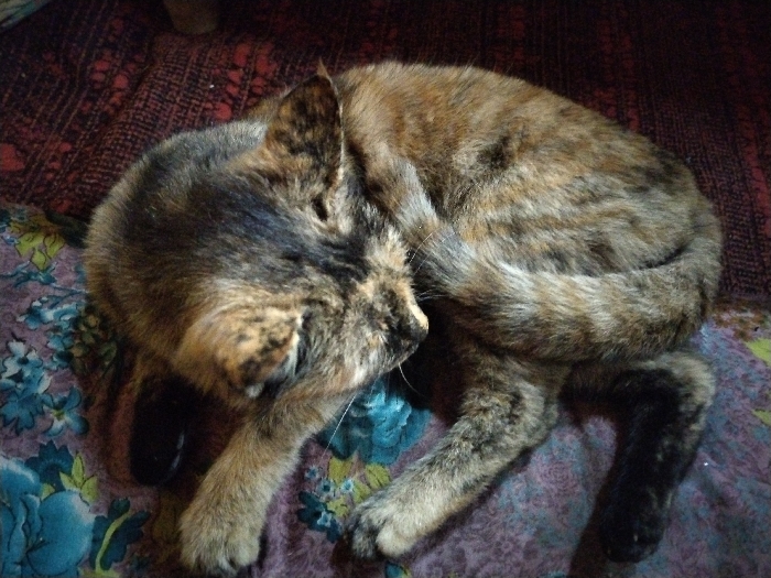 - "A tortoiseshell cat is curled up on a bed with floral and burgundy patterned sheets" by FM-CNZ8C3, licensed under CC BY 4.0