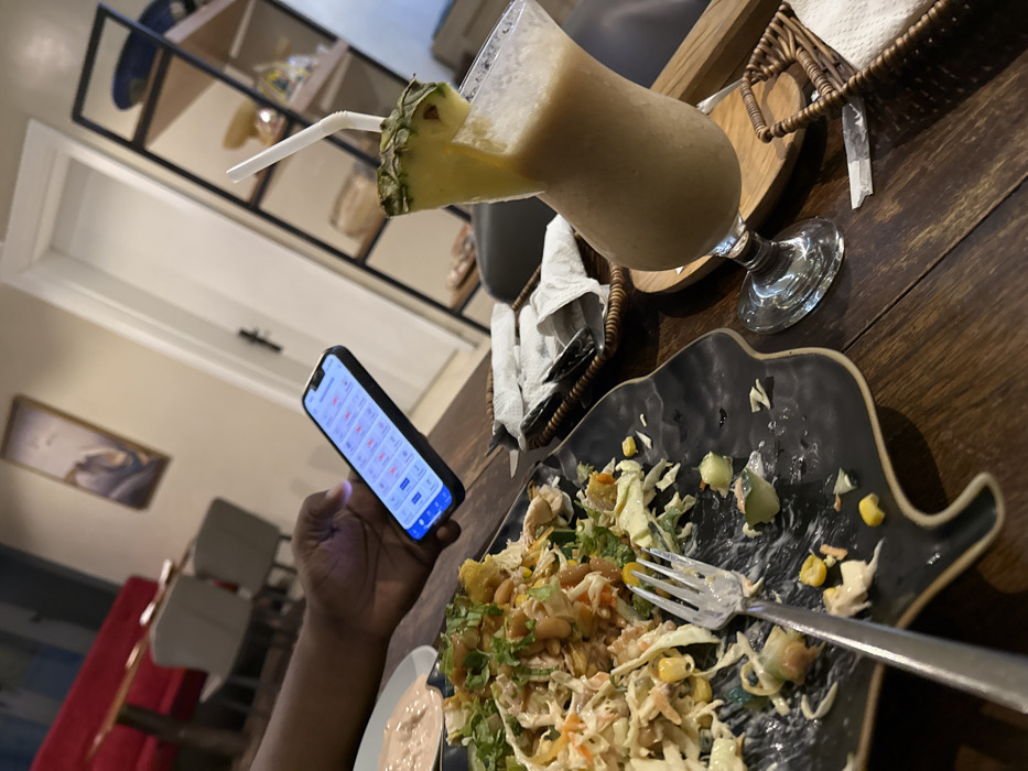 A partially eaten salad on an elephant-shaped black plate sits next to a tall glass of pineapple smoothie. A person holds a smartphone displaying a grid of boxes, some with red "X" marks and others blue. A wooden table is the base for a woven basket containing napkins, and a circular wooden tray. The background features blurred furniture and wall decorations. A fork rests on the salad plate, suggesting a paused meal.