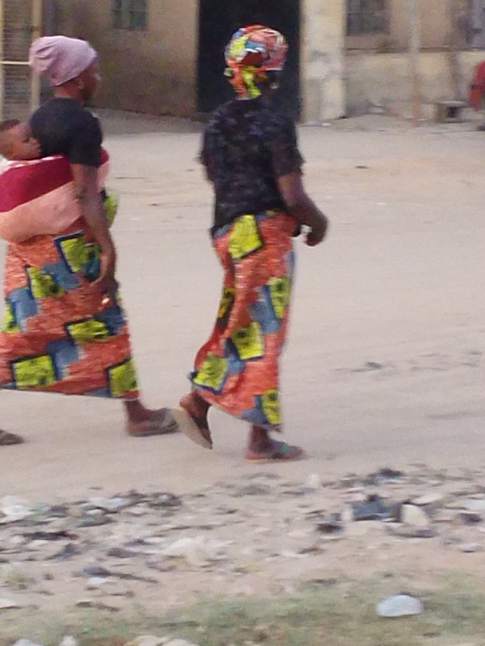 Two adult females and one infant are observed walking on an unpaved surface in Sabon Gari East, Nigeria