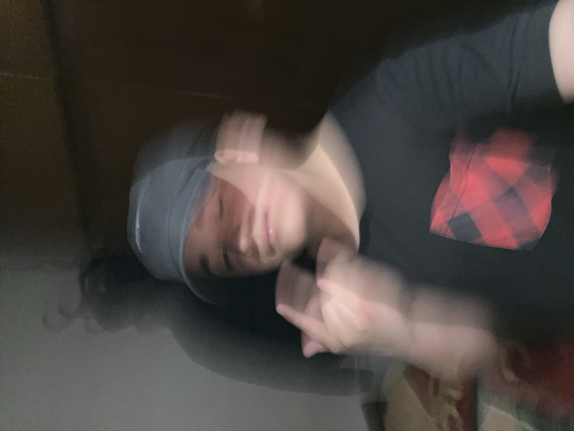 A blurry image shows a person wearing a grey beanie and a black t-shirt with a red and black plaid patch, oriented sideways