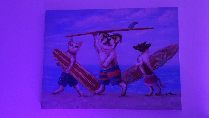This image depicts a photograph of a rectangular painting mounted on a light-colored wall, illuminated by a strong purple light