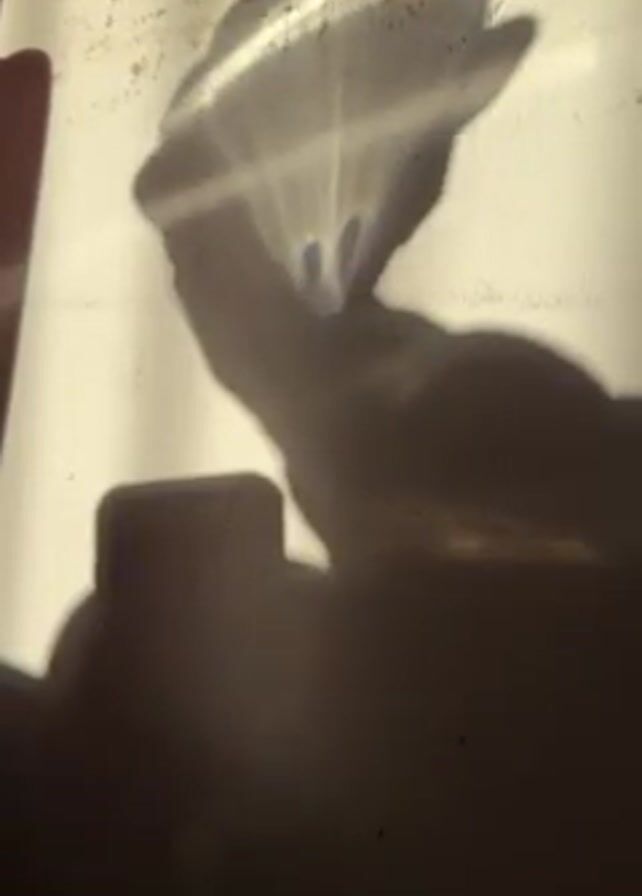 shadow cast on a textured, light-colored wall. The shadow is of a hand holding what appears to be a glass of water. Light shines through the glass, creating bright, refracted patterns on the wall behind it. A portion of what looks like a phone or other rectangular object is also visible at the bottom of the shadow. The scene appears to be indoors with sunlight as the light source.