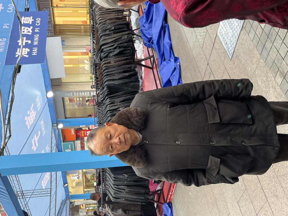 An elderly man wearing a dark puffer coat with a fur collar stands in what appears to be an outdoor clothing market. Racks of dark jackets hang in the background. A blue sign reads "Hai Ning Pi Cao" in Chinese and English, possibly indicating the name of the market or a particular vendor. Other shop signs are visible further back. The man looks directly at the camera with a slightly concerned expression. Another person wearing a red shirt is partially visible in the upper right corner.
