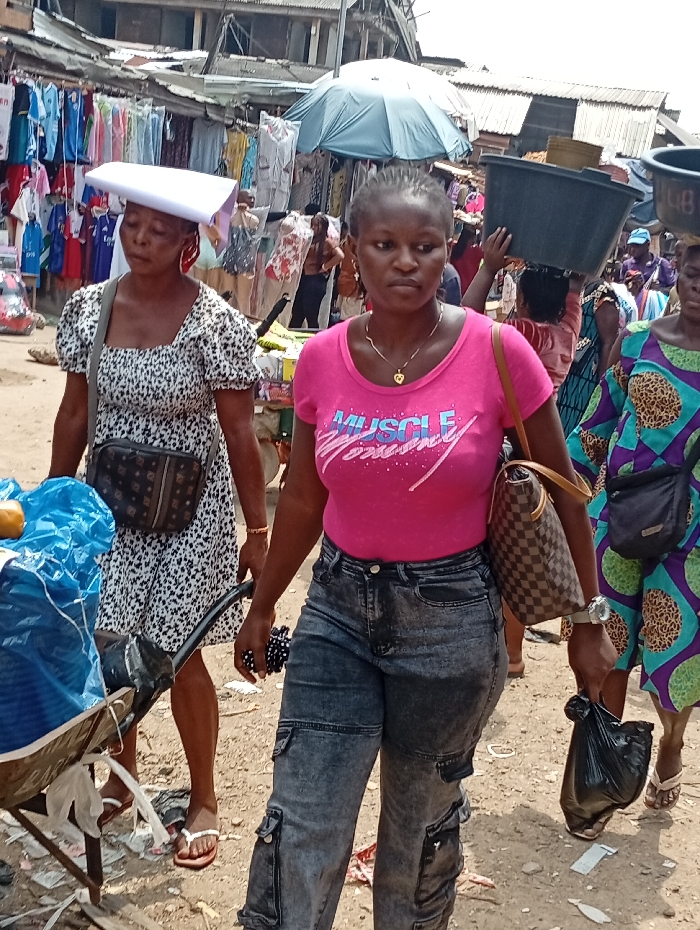 A bustling outdoor market scene shows three women in the foreground. One wears a pink t-shirt and gray cargo pants, carrying a purse and a black plastic bag. Another, to her left, wears a black and white dress with a purse, and a white object is balanced on her head. A third woman, on the right, wears a colorful patterned dress. Other shoppers and stalls are visible in the background, with clothes hanging for sale and someone carrying a large black container on their head.