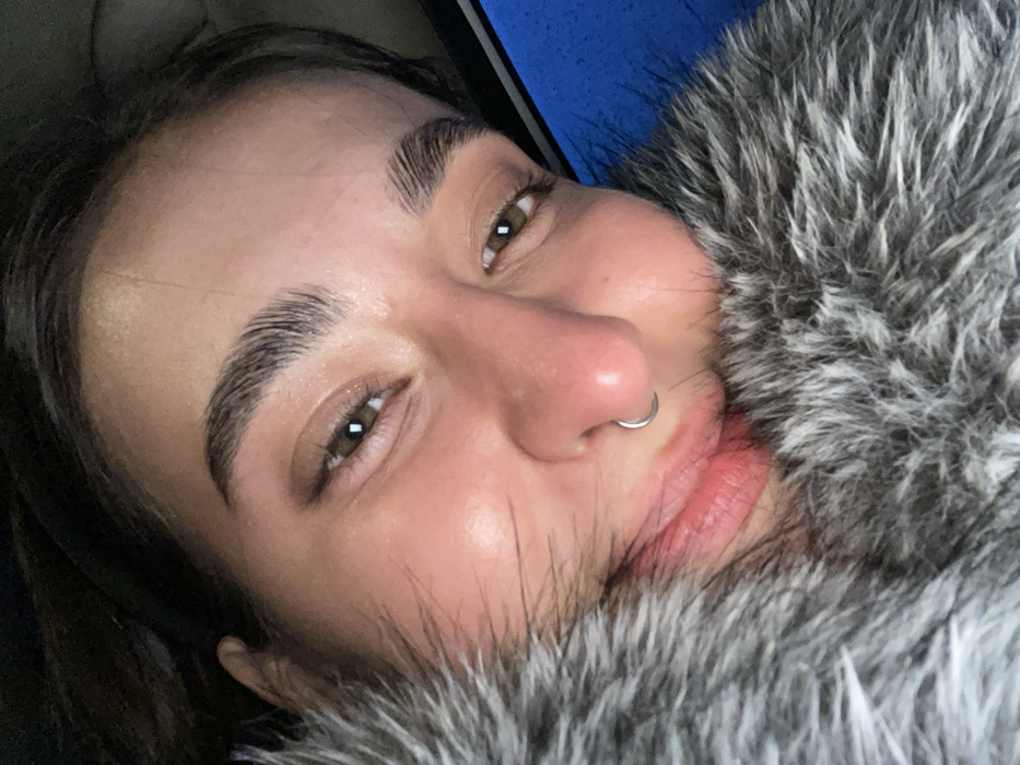 This image depicts a close-up portrait of a female individual, described as being in Krasnoyarsk, Russia. The subject's face occupies the majority of the frame, captured from a slightly upward angle. She possesses brown eyes, prominent, well-defined eyebrows, and dark hair, portions of which are visible at the top and left of her head. A silver-toned septum piercing is visible on her nose. Her lips are slightly parted, exhibiting a pinkish tone, and her skin shows a reflective sheen, particularly on the cheeks and forehead. She displays a subtle, closed-mouth smile, with her gaze directed forward, engaging the camera. The lower part of her face and chin are partially obscured by a thick, multi-toned grey and white fur or faux fur collar or hood, into which she appears to be nestled. The background is largely indistinct; a dark area is visible to the upper left, while a vibrant blue surface or fabric element is present on the right side of the frame. The overall impression suggests a selfie taken in a cozy or warm setting.