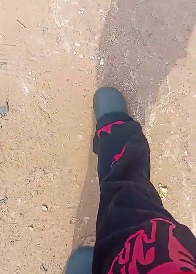 A person's feet are walking on dirt and small rocks in the sunlight. They are wearing teal rubber shoes and black pants with pink star patterns. The person's shadow is visible on the ground.