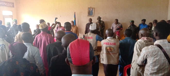 A crowded room filled with people, many facing a group at the front. Two individuals wear vests labeled "PRESSE" in white letters. Several men are in military uniforms, positioned behind a table. An unfurled flag is placed behind them next to a framed picture on the wall. Most attendees are civilians. The scene appears to be a press conference or a formal address to the community.