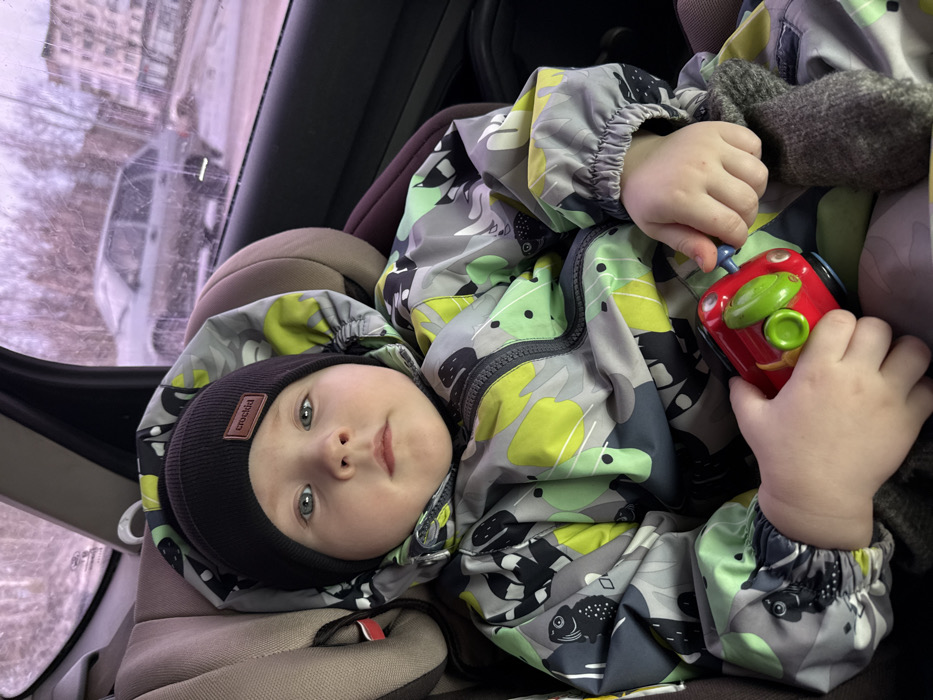 - "A young child, approximately a toddler, with light skin and light blue eyes, is depicted seated in a tan-colored child car seat within a vehicle" by FM-PTkG02, licensed under CC BY 4.0