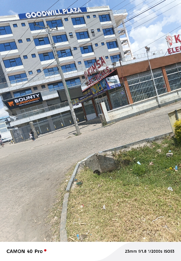 The image displays an urban street scene in Nakuru East ward, Nakuru City, Kenya, under a partly cloudy sky. The prominent structure is the multi-story "GOODWILL PLAZA," a grey building with numerous blue-tinted windows, which houses "BOUNTY SUPERMARKET" on its ground floor, marked by an orange shopping cart logo. Adjacent to Goodwill Plaza, a shorter, two-story brown building with barred windows features a red sign for "KIMSA ELECTRICALS," identifiable by a lightbulb emblem. In the foreground, a paved street curves from the lower left toward the mid-right. A concrete curb separates the street from a grassy area that occupies the lower right, containing scattered litter including plastic and paper debris. A dark utility pole with overhead wires stands centrally, partially obscuring the buildings. Two individuals are visible on the sidewalk in front of the "BOUNTY SUPERMARKET" entrance, their features indistinct due to distance and resolution. Security gates are visible at the entrance to the supermarket. Overhead streetlights are mounted along the roofline of the Kimsa Electricals building. The scene is illuminated by daylight.