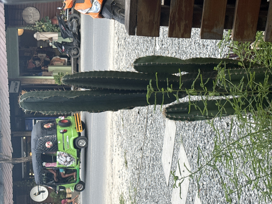 This image depicts a street scene in General Luna, Philippines. In the immediate foreground, a cluster of tall, dark green columnar cacti with visible spines emerges from a bed of light grey gravel. Smaller, delicate green foliage grows around the cacti's bases. To the far right, a section of a reddish-brown wooden slatted structure is partially visible. Two light grey rectangular paving stones are embedded in the gravel to the left of the cacti. Across the gravel, an asphalt road extends horizontally. On this road, a lime green motor-tricycle, characterized by a black canopy roof and decorative side panels, is positioned, facing right. A person with dark skin is visible within the driver's compartment of the motor-tricycle. Further down the road, on the opposite side, a black scooter is parked, and the front section of an orange scooter is partially visible on the far right. The background consists of a row of commercial buildings lining the far side of the street. The building on the left features a circular white sign with a black graphic. Other storefronts display various signs, including a rectangular sign labeled "LITTLE NAP" and a circular wooden plaque bearing the text "MISPO." The buildings have dark-colored corrugated roofs. The scene is illuminated by ambient daylight.