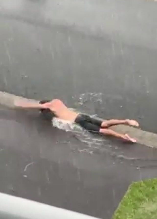 A shirtless person wearing dark shorts is swimming in the street during a heavy rainstorm. The person is moving across the flooded asphalt, performing a freestyle stroke. The rain is falling intensely, causing splashes around the person. The area is bordered by grass and a curb. The video is taken from an elevated position, possibly a balcony.
