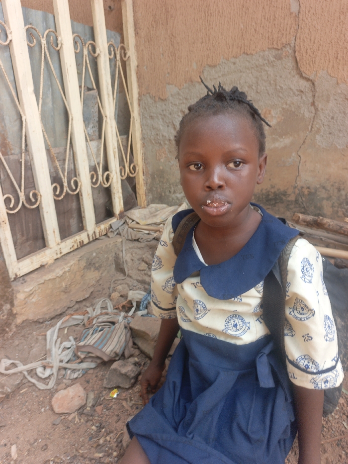 In Akwanga, Nigeria, a medium shot captures a young Black female child, approximately 6-10 years old, sitting or squatting outdoors