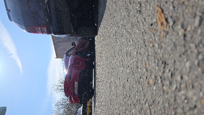 The image displays an outdoor parking area in Neuhof, Germany, under bright daylight conditions. The foreground consists of a granular, dark gray asphalt or gravel surface, appearing out of focus. In the midground, a red Toyota Supra (A90 model) is parked, facing away from the camera, its rear visible. The vehicle bears a German license plate, "FD-BR 642". To the immediate right, the rear section of a dark-colored commercial van, possibly a Mercedes-Benz Sprinter, is parked, partially obstructing the view of the red car. A portion of a yellow vehicle is discernible in the far left background, behind the red car. The background includes several bare-branched trees on the left side and a light-colored, possibly concrete or stucco, building or wall structure on the right. The sky overhead is clear blue with minimal, wispy white clouds. Strong sunlight from the upper right illuminates the scene, creating defined shadows. No individuals are present within the frame.