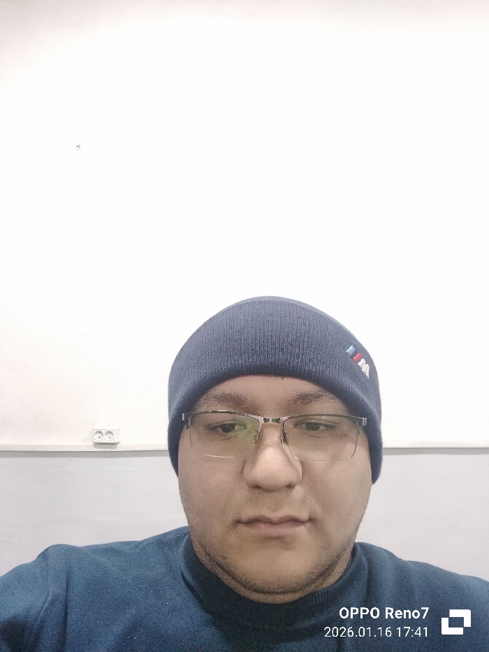 A male individual is shown in a close-up, chest-up view, directly facing the camera. He wears a dark blue knitted beanie featuring a multi-colored logo (blue, light blue, and red stripes, consistent with the BMW M emblem) on the left front side. Rectangular glasses with metallic frames are worn. He is dressed in a dark blue long-sleeved top or sweater. The background is a plain, light-colored wall, predominantly white, with a white double electrical outlet visible on the upper-left portion. A faint horizontal line suggests a two-tone wall, with a slightly darker lower section. The image was captured with an "OPPO Reno7" on "2026.01.16 at 17:41." The indoor environment provides no specific visual cues to identify a precise location within Namangan City, Uzbekistan.