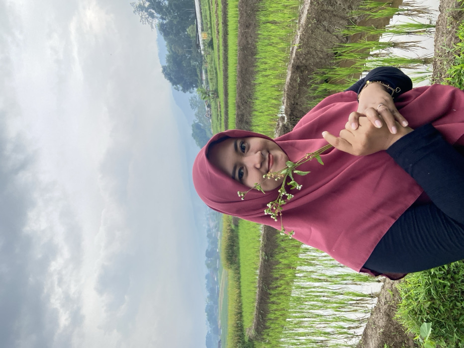 A woman is depicted from the waist up, centered in the frame, posing in a rural agricultural landscape identified as being in the city of Tamiajeng, Indonesia