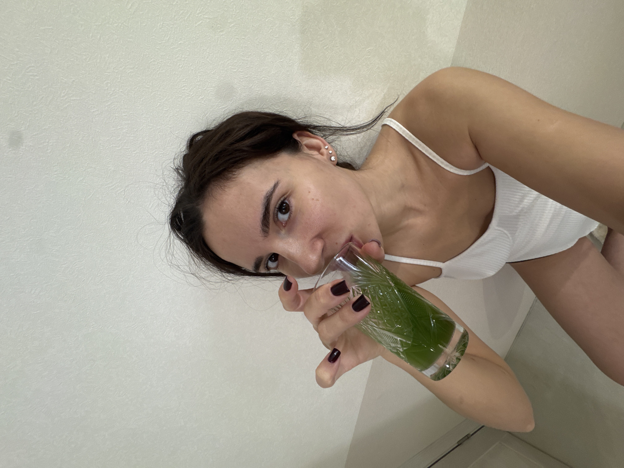 - "A woman with dark hair pulled back, wearing a white tank top, is drinking a green liquid from a crystal glass" by FM-2DM6L2, licensed under CC BY 4.0