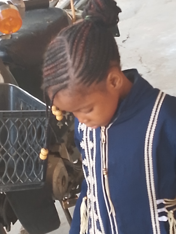 An image captured in Gwagwarwa, Nigeria, shows a young child with dark skin, positioned in what appears to be a covered or indoor setting. The child's head is bowed, looking downwards. They have intricately braided dark hair with reddish highlights, styled in cornrows leading to an updo, and two front braids adorned with light-colored, spherical beads. The child wears a dark blue, long-sleeved garment featuring white embroidered patterns, including vertical stripes and floral motifs, and a central zipper with an ornate pull. Small white tassels are visible at the lower ends of some embroidery. To the left of the child, parts of a dark-colored motorcycle or scooter are visible, including an orange reflector or light at the top left, a black plastic basket with a woven pattern, and various mechanical components. The background consists of a light-colored, possibly concrete or dusty, surface.