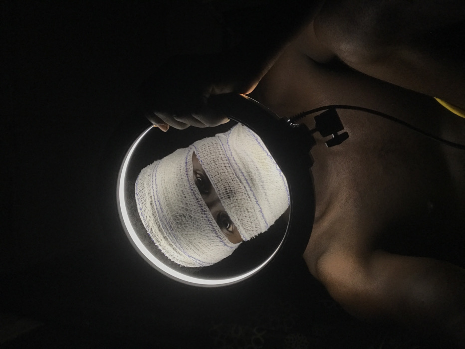 A dark, striking image features a person's head wrapped entirely in white bandages, visible only through a narrow opening for the eyes. The face is illuminated by a circular light held in someone's hand. The person's upper body, which is exposed, is visible in the background. The dramatic lighting and tight composition create a sense of tension and mystery.