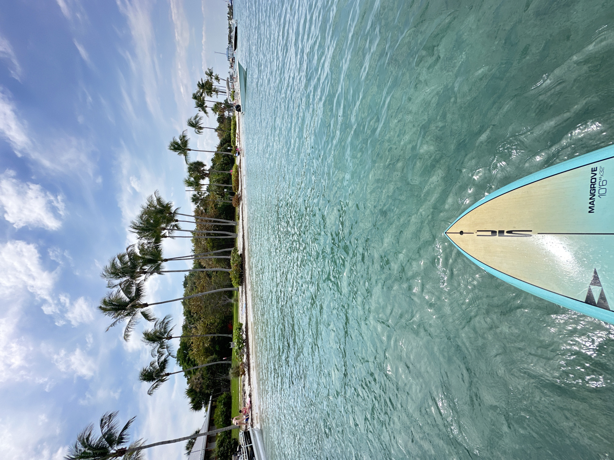 The image depicts a first-person perspective from the bow of an SIC Mangrove 10'6"x32" paddleboard on clear, shallow, turquoise water. The scene is located in Palm Beach Shores, United States of America. In the midground, a narrow white sand beach is visible, transitioning into a grassy area bordered by dense tropical vegetation, dominated by numerous tall palm trees. On the left side of the beach, a white pontoon boat is partially visible. Near it, a person in a dark bikini top and light bottoms stands close to the water, while a smaller individual is seated on a pink towel on the sand. Further right along the shoreline, another person is discernible, lying or seated on the beach. A white center console boat with an outboard motor is moored offshore to the right of the beachgoers. In the distant background, several other boats, including a black vessel, are present on the water. A building with a light-colored roof is partially visible behind the trees on the far left. The sky is blue with scattered white, wispy clouds. The water exhibits surface ripples and sun reflections.