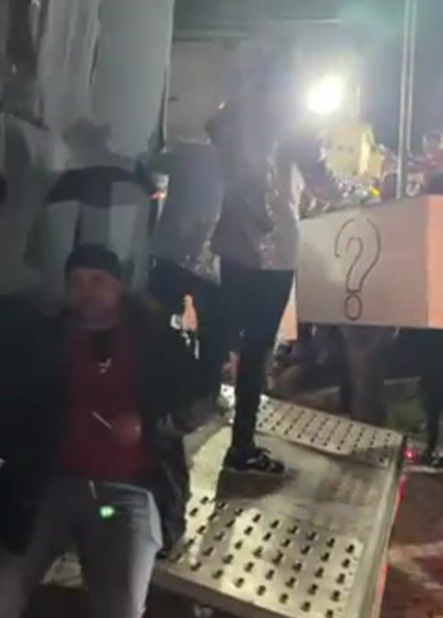 At night, a man in a red shirt and jeans sits on the metal platform of a truck trailer, smoking. The trailer is attached to a black vehicle. The back of two other men are visible standing on the trailer; they are both wearing shiny silver jackets, black pants, and black hats. One of them holds a cardboard box with a large question mark drawn on it. People stand around the trailer, observing. In the background are buildings and light sources.