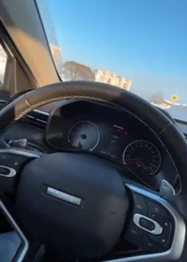 interior of a car, specifically the dashboard and steering wheel, as it drives down a snow-covered street under a bright, clear blue sky. The steering wheel is black with silver accents and the HAVAL logo in the center. The dashboard features two analog gauges and a small digital display in the center. The environment outside the car includes snow-covered ground, a building in the distance, and a few other cars on the road. The driver's hand is visible on the steering wheel, and briefly operating a smart watch on the left wrist. The video ends as the car continues to move forward along the snowy road.