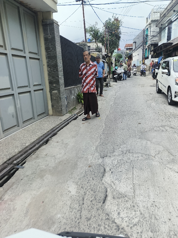 The image depicts a residential street in Cimenyan, Indonesia, under an overcast sky. In the immediate foreground, a mature man with a mustache and goatee stands on the left side of the concrete street, facing slightly towards the camera. He wears a red and white striped short-sleeved collared shirt and dark brown sarong-style trousers, with dark sandals on his feet, and his hands are positioned behind his back. To his left is a large light grey panelled gate and a dark grey textured wall with a concrete curb and an open drainage channel at its base. Behind the central figure, a second man in a light blue polo shirt and dark trousers stands on the street. The street itself is concrete, showing signs of wear and minor undulations, and extends uphill, curving slightly to the right. Further down the street, multiple individuals are visible, some walking and others riding or standing near motorcycles. A white four-door hatchback car is parked or slowly moving on the right side of the street, facing away from the camera. Residential buildings with varied facades line both sides of the street, and numerous overhead utility lines are visible against the cloudy sky. The very bottom edge of the image reveals a partial white, curved surface, likely from the vehicle of the photographer.