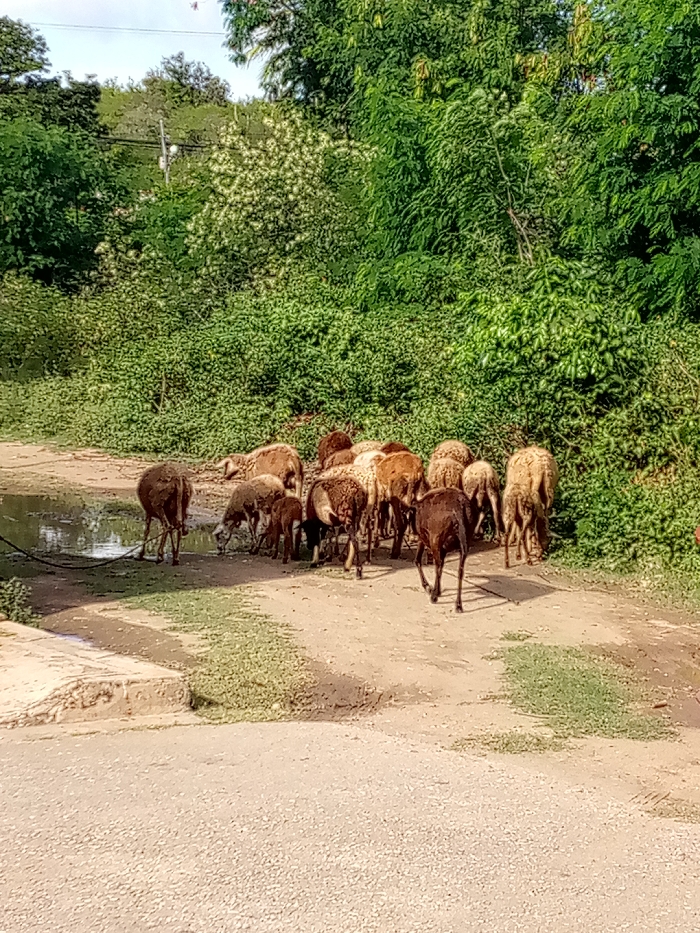 A flock of sheep gathers near a water puddle on a dirt road. The sheep vary in color from light brown to dark brown, with one standing out as distinctly darker. Lush green foliage fills the background, creating a dense wall of trees and shrubs. A portion of a paved road is visible in the foreground, suggesting a rural or semi-rural environment where livestock intersects with infrastructure.