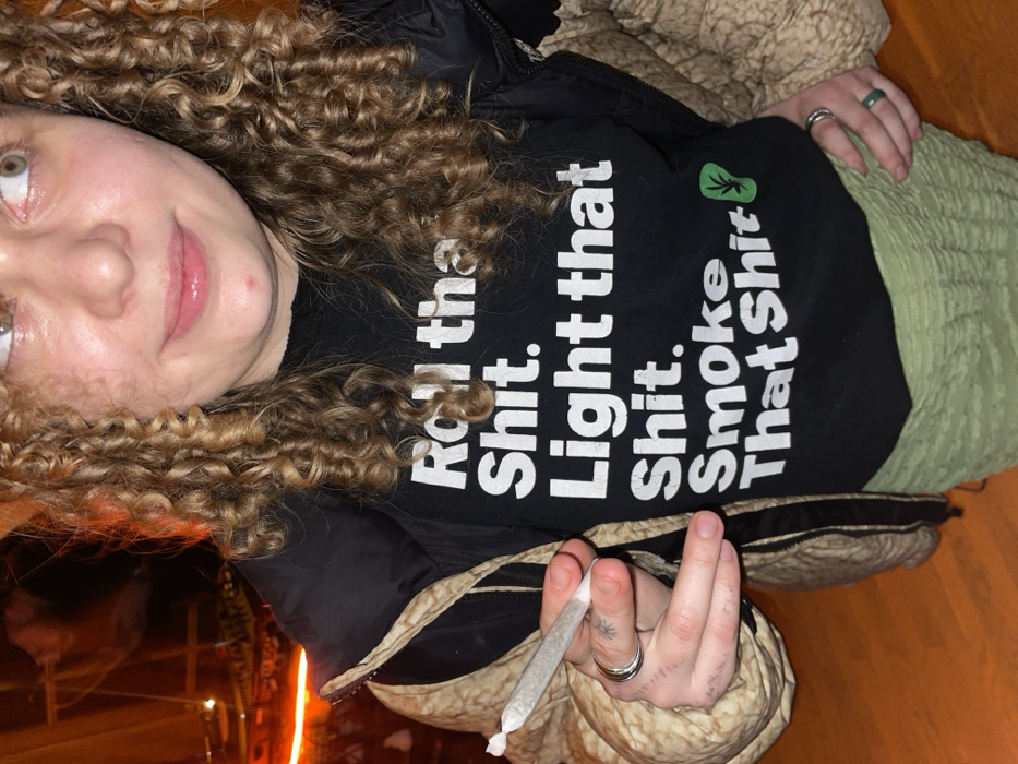 A person with curly hair holds a lit joint. They wear a black t-shirt with white text that reads "Roll the Shit. Light that Shit. Smoke that Shit." A green marijuana leaf is illustrated above the word "Shit." The person wears rings on their fingers, a green textured skirt, and a jacket. The background is blurry.