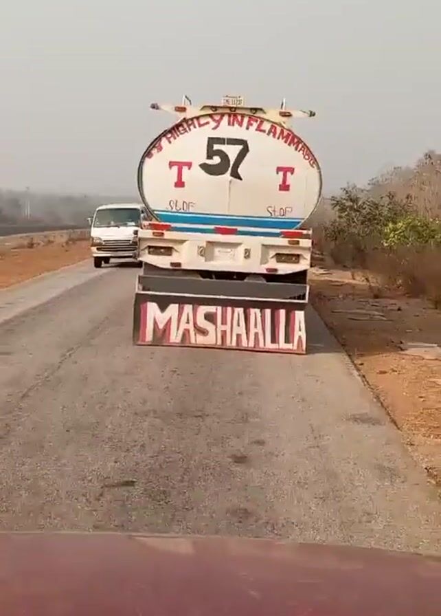 The video, taken from the perspective of a moving vehicle, shows a white tanker truck ahead on a cracked asphalt road. The tanker has an oval shape and is labeled "HIGHLY INFLAMMABLE" with the number 57 and the word "STOP" on either side of the number. The word "MASHAALLA" is written in large red letters on the mud flaps. A white van passes on the left and another red tanker truck appears in the distance behind it. The surrounding environment consists of dry, hazy scenery with sparse vegetation on the sides of the road. The sky is overcast.
