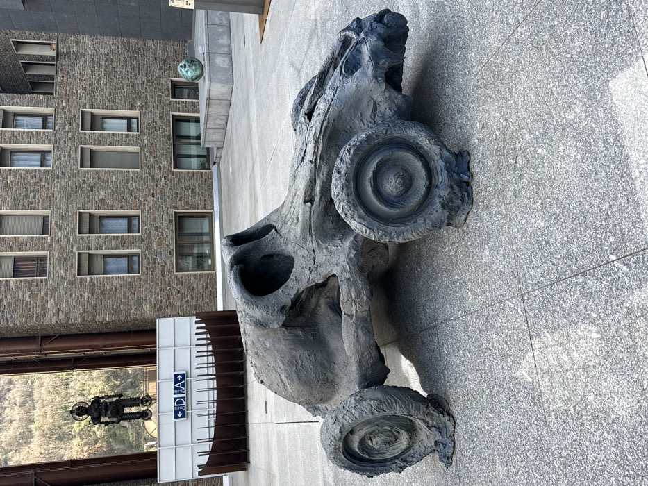 The scene depicts an outdoor plaza in Andorra la Vella, Andorra. A large, dark grey sculpture resembling an archaic vehicle or an elongated animal skull with four solid, textured wheels occupies the foreground, resting on light grey granite paving. To the mid-left, a tall, rusty brown metal structure frames a dark, stylized humanoid figure or robot, standing on two circular bases. Below this, a white rectangular sign with blue directional arrows and the letters "D A" is present, fronted by a curved, rusted metal barrier. To the mid-right, a multi-story building constructed of light brown, cut stone features numerous rectangular windows with blinds. On a raised grey platform to the right of this building, a spherical, greenish-blue sculpture is visible. The background on the far left shows a densely vegetated, forested mountain slope. No individuals or active interactions are present in the frame.