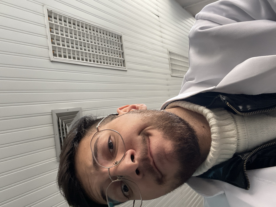 The image presents a close-up, upward-angled selfie featuring an adult male. The subject has dark hair, a neatly trimmed beard and mustache, and wears round, metallic-rimmed eyeglasses. He displays a slight facial expression with puckered lips and subtly raised eyebrows, looking directly into the camera. He is dressed in a white lab coat worn over a black zippered jacket, which conceals a cream-colored, ribbed turtleneck sweater. The background is a plain white ceiling constructed from longitudinal panels. Embedded within the ceiling are two fixtures: a square metallic air vent located on the left side of the frame, and a rectangular light fixture with a grid diffuser situated on the right. The lighting is bright and even. There are no discernible contextual or architectural features within the image to specify a particular location within the city of Homs, Syria.