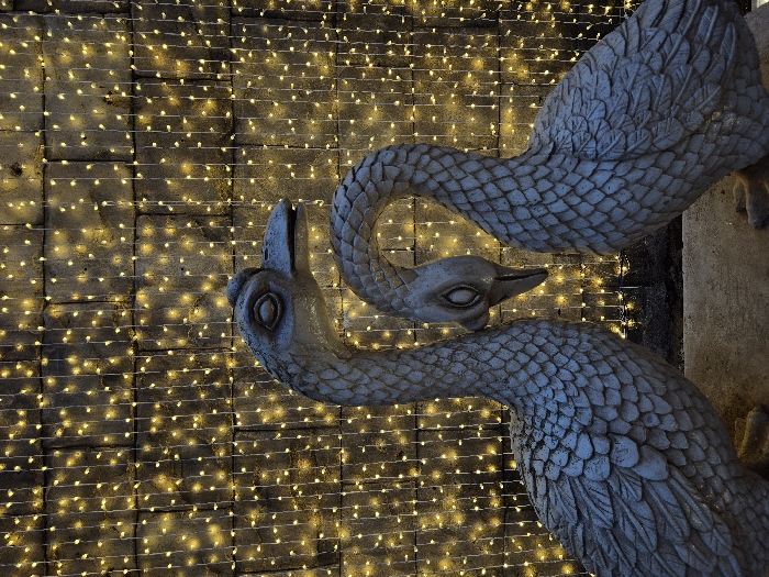 Two weathered grey stone statues, stylized to resemble large, long-necked birds with scale-like or feather-like textures, stand on a dark base. The statue on the left faces slightly right and forward, with its head raised. The statue on the right has its neck curved downwards, its head bowed towards the base. Both statues have carved, closed-appearing eyes and exhibit some dark discoloration or weathering. They are positioned against a backdrop of a rough-hewn grey stone wall, which is entirely covered by numerous vertical strands of warm yellow LED fairy lights, creating a dense, illuminated curtain effect. No human figures are present. This installation is located within the Sun World Ba Na Hills complex, southwest of Đà Nẵng, Vietnam.