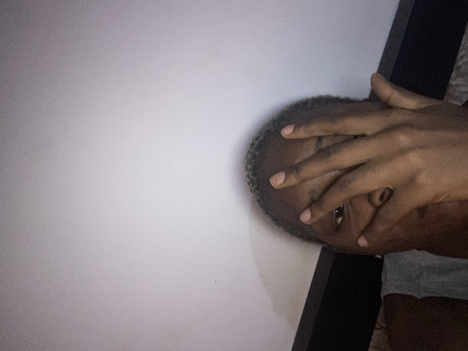 The image displays a close-up of an individual in an indoor setting, specifically in Sabon Tasha, Nigeria. The subject, who has dark skin and short, light-colored hair, is positioned in the lower half of the frame, partially obscuring their face with their right hand. The fingers are splayed across the face, with the thumb covering the chin and the index finger extending towards the nose. One eye, the subject's left, is visible, looking directly towards the camera. The background consists predominantly of a plain, light-colored ceiling or upper wall. A dark, linear object, possibly a piece of furniture like a headboard, is visible along the bottom-left edge of the frame, partially obscured by the subject's head and shoulder. Light-colored fabric, possibly bedding or clothing, is also visible to the lower left of the subject. The lighting is soft and ambient.