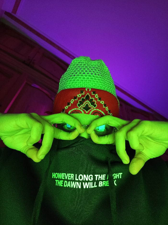 A person wears a green knitted cap and a red paisley bandana. They're illuminated by purple and green lighting. A black hoodie covers their face up to the nose with the words "HOWEVER LONG THE NIGHT THE DAWN WILL BREAK" printed in white. The person holds up both hands, making circles around their eyes with their fingers. The background has a purple ceiling and wood paneling.