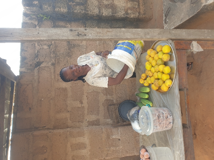 This image depicts an outdoor market stall in Nkpor, Nigeria. A woman with dark skin and braided hair, wearing a light-colored short-sleeved top and a necklace, stands behind a wooden table. She is smiling and looking directly towards the camera. Her hands are inside a large, white plastic bucket with blue and yellow labels. The wooden table is covered with a clear plastic sheet. On the table, from left to right, are: a metal plate holding approximately twelve light-colored eggs, which rests on a clear plastic container; a lidded clear plastic container filled with numerous small, reddish-brown, irregular-shaped items; a row of five green cucumbers; and a round metallic tray displaying numerous small, yellow, spherical fruits. Behind the eggs, a dark, circular object is visible, and behind the cucumbers, another dark, round object rests on the table. The background consists of unplastered concrete block walls. A partial view of a simple corrugated roof structure is visible at the top. A wooden post supports the roof on the right side of the frame. A small wooden chair is propped against the left wall. On the far right, next to the wooden post, a dark, possibly sooted, cooking surface or structure is present. The ground appears to be dirt.