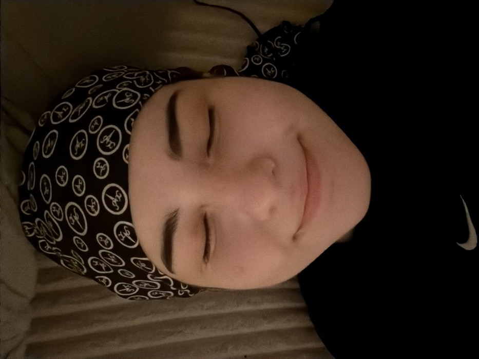 A person lies on their back with eyes closed and a slight smile. They wear a black head covering with a white logo pattern and a black Nike shirt. The scene appears to be dimly lit, with a striped, textured surface partially visible behind their head. The person's skin tone is light, and their eyebrows are dark and defined.
