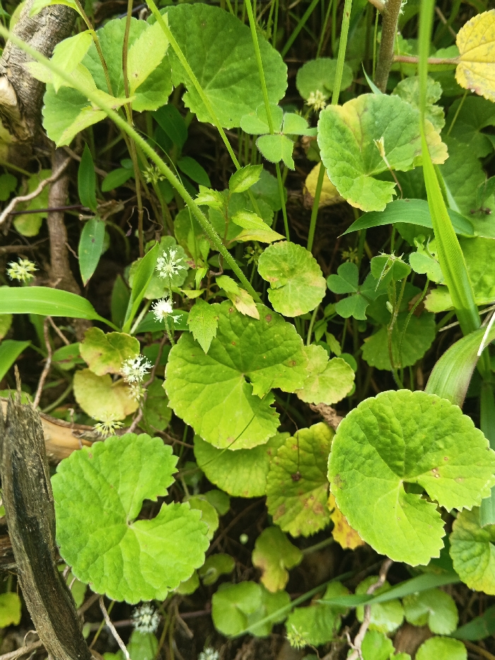 The image displays a close-up, ground-level view of dense vegetation in the city of Kwekwe, Zimbabwe. The scene is dominated by various green plants, primarily featuring numerous bright green, kidney-shaped leaves with distinct crenate or scalloped margins, consistent with *Hydrocotyle* species. Some of these leaves exhibit minor yellowing or small brown spots. Interspersed within this foliage are smaller green leaves, including some appearing clover-like or elliptical, and slender blades of grass. Several delicate white flowers, arranged in small, star-like clusters (umbels), are visible on thin stems throughout the composition. A piece of weathered, light brown dead wood or bark is partially visible on the left side of the frame, integrated into the plant growth. The undergrowth appears dark, suggesting soil or deep shadows beneath the thick canopy of leaves. No individuals or man-made objects are visible, indicating a natural, uncultivated environment.