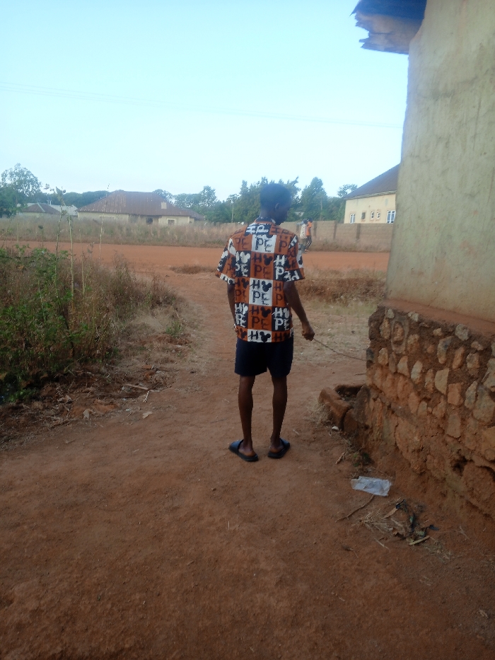 A person wearing a patterned shirt, dark shorts, and sandals stands on a dirt path. They are facing away from the camera and appear to be holding a stick. To the right is a building with a stone foundation and a crumbling roof. In the background, there are other buildings and trees. The sky is light blue and clear.