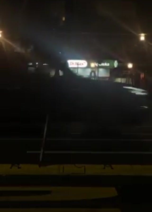 nighttime scene of a Dr. Max pharmacy and a street crossing. The pharmacy is in the background, illuminated, with the "Dr. Max" sign clearly visible. In front of the pharmacy are some dark objects. The street crossing has yellow and white stripes, and a few steps lead up to the pharmacy. A car passes by on the road. The lighting is dim, with street lights providing some illumination. Overall, the scene is quiet and still, save for the passing car.