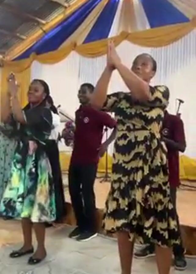 small group of people, presumably a choir, singing and dancing in what appears to be a church or event hall. Three women are at the forefront, dancing with their arms raised and moving to the music. They are wearing dresses in varying patterns. Behind them, several men are clapping and swaying to the music, dressed in maroon shirts and black pants. The hall is decorated with blue and yellow drapes hanging from the ceiling, and a ceiling fan is visible. There are microphones set up, suggesting a live performance or recording. The floor is made of light-colored tiles. Overall, the scene exudes a joyful and celebratory atmosphere.