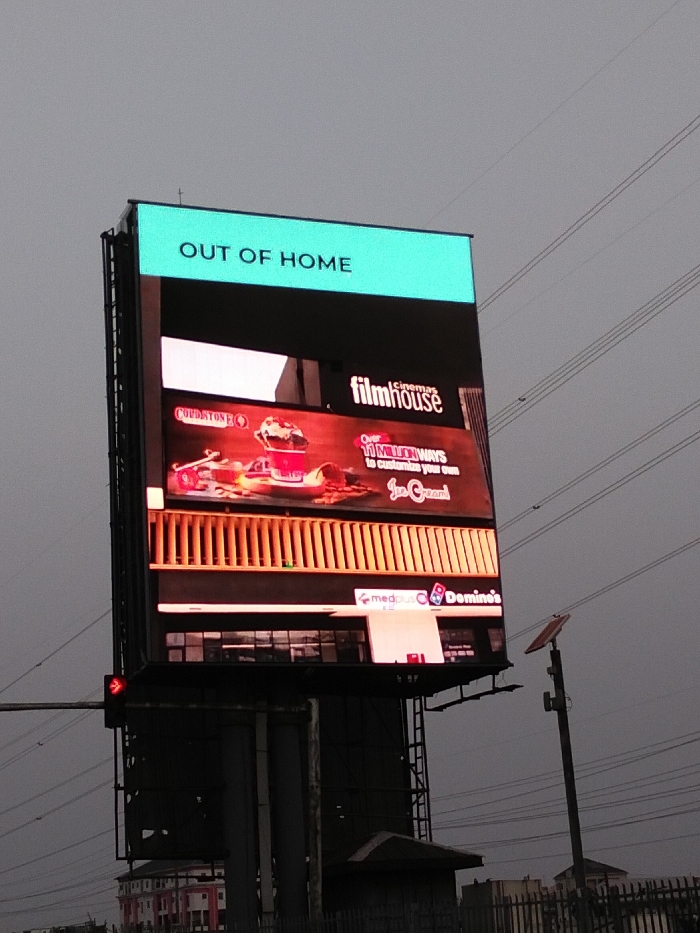 An illuminated digital billboard stands prominently in Jakande, Nigeria, under an overcast gray sky