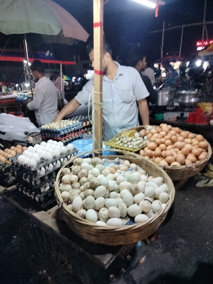 n outdoor market stall in Barishal, Bangladesh, at night. A man in a light blue shirt is standing behind a wooden post, holding a basket of white eggs in front of him. To the left, another man is standing, looking towards the right. The stall has several baskets full of eggs on display: one large basket full of brown eggs, one large basket of white eggs, and one smaller basket of brown eggs. There is also a stack of plastic containers filled with white and brown eggs. The stall is located on a dark street, lit by overhead lights. The environment appears to be a night market, with other stalls and people visible in the background. The location is determined by the coordinates 22.713 latitude and 90.349 longitude, which places the image in Barishal, Bangladesh. There are also a few other people visible in the background, but their features are not discernible in the image.