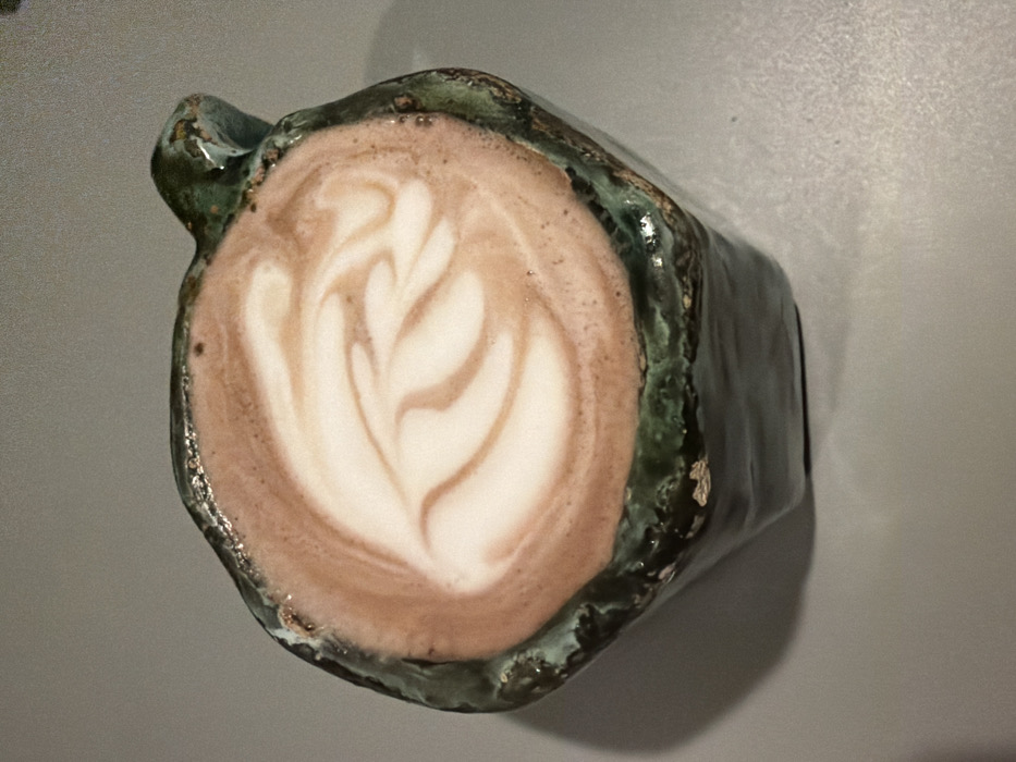 A close-up depicts a mug filled with a beverage, likely a latte or cappuccino, displaying latte art