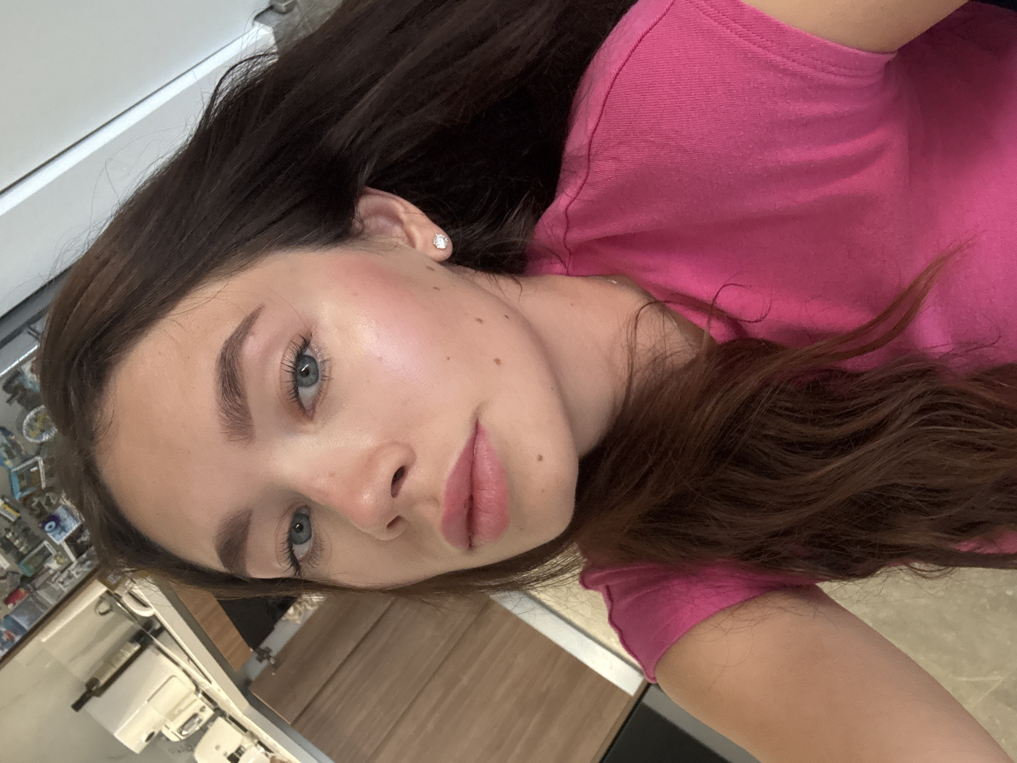 A young woman with long brown hair and blue eyes is taking a selfie indoors