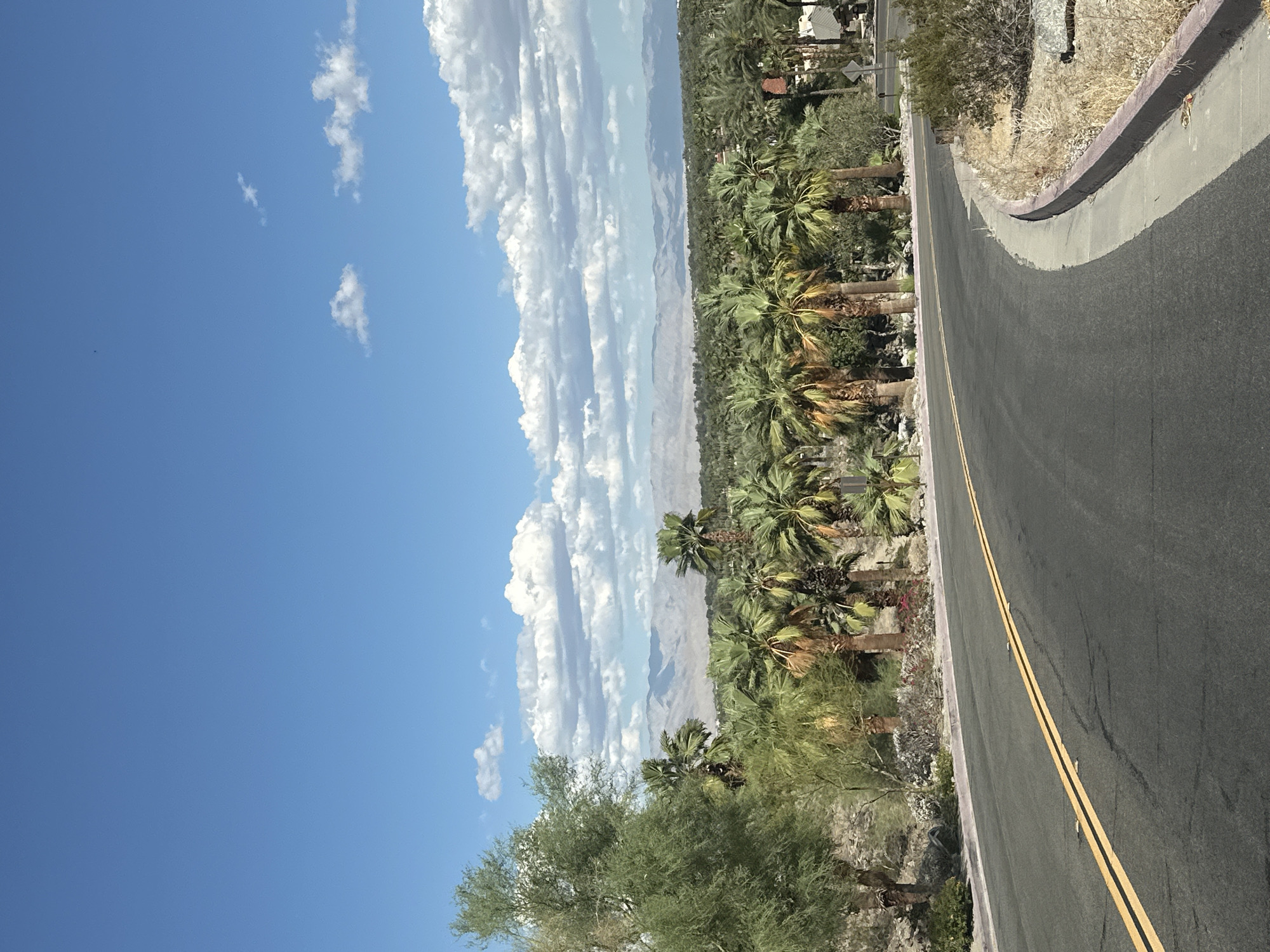 The image depicts a sunny day in Rancho Mirage, United States of America. A winding asphalt road with double yellow lines runs diagonally through the right side of the frame. Lush palm trees and vegetation line the roadside. In the distance, mountains are visible under a sky filled with puffy white clouds. The left side of the frame is dominated by a clear blue sky.