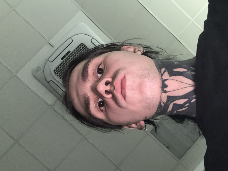 The image presents a low-angle portrait of a male individual inside a building in Rostov-on-Don, Russia. The subject has dark, medium-length hair, a thin mustache, and light facial stubble. Dark eyes are directed forward. A septum piercing is visible. The subject's left ear (viewer's right) displays two piercings: one small hoop and one small dangle earring. The right ear (viewer's left) has one small hoop piercing. The neck features extensive blackwork tattooing, extending from below the jawline to the upper chest, comprising abstract and symmetrical patterns, including a prominent central design. The subject wears a plain black crew-neck garment. The overhead environment consists of a light-colored suspended ceiling with square acoustic panels. A white, ceiling-mounted air conditioning unit with a central grille is visible in the upper right.