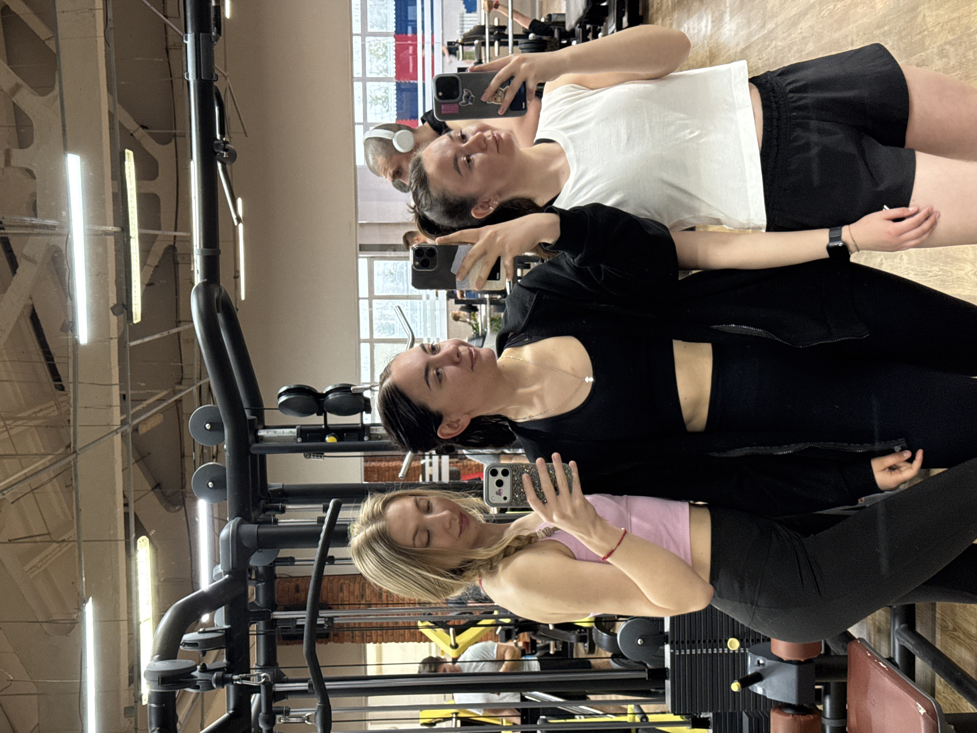 Three women are taking a selfie in a gym. The gym is located in Chaikovsky, Russia. They are standing in front of a mirror and holding their phones up to take the picture. The women are dressed in workout clothes. The gym has weight machines and other exercise equipment. The lighting is bright. The floor is wooden.